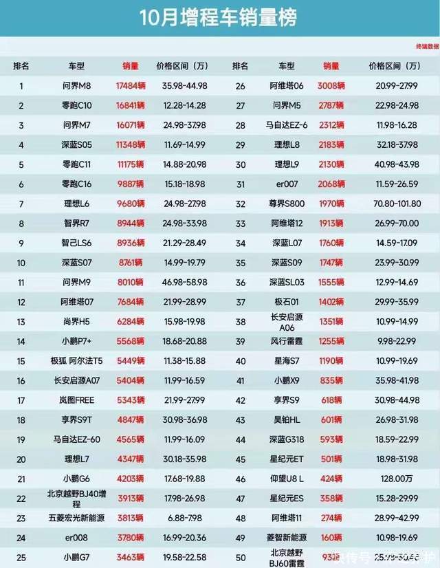 近期10月增程式电动车市场的销量数据陆续公布,整体市场呈现出空前活跃的态势,前十名车型中有五款车型销量破万,其中问界、零跑和深蓝品牌表现领先。目前增程技术以其“城市用电、长途用油”的灵活特性,有效缓解了用户的续航焦虑,已成为新能源市场中的重要选择,接下来我们就来看看前十名车型的表现吧。