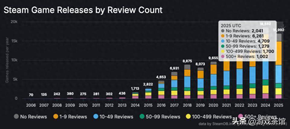 SteamDB数据显示,今年上线Steam的新游戏已接近17000款,其中有超过8000款收到的评论数低于10条,仅有3000多款游戏突破50条评论大关。